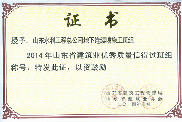 公司“地下连续墙施工班组”荣获2014年山东省建筑业优秀质量信得过班组称号